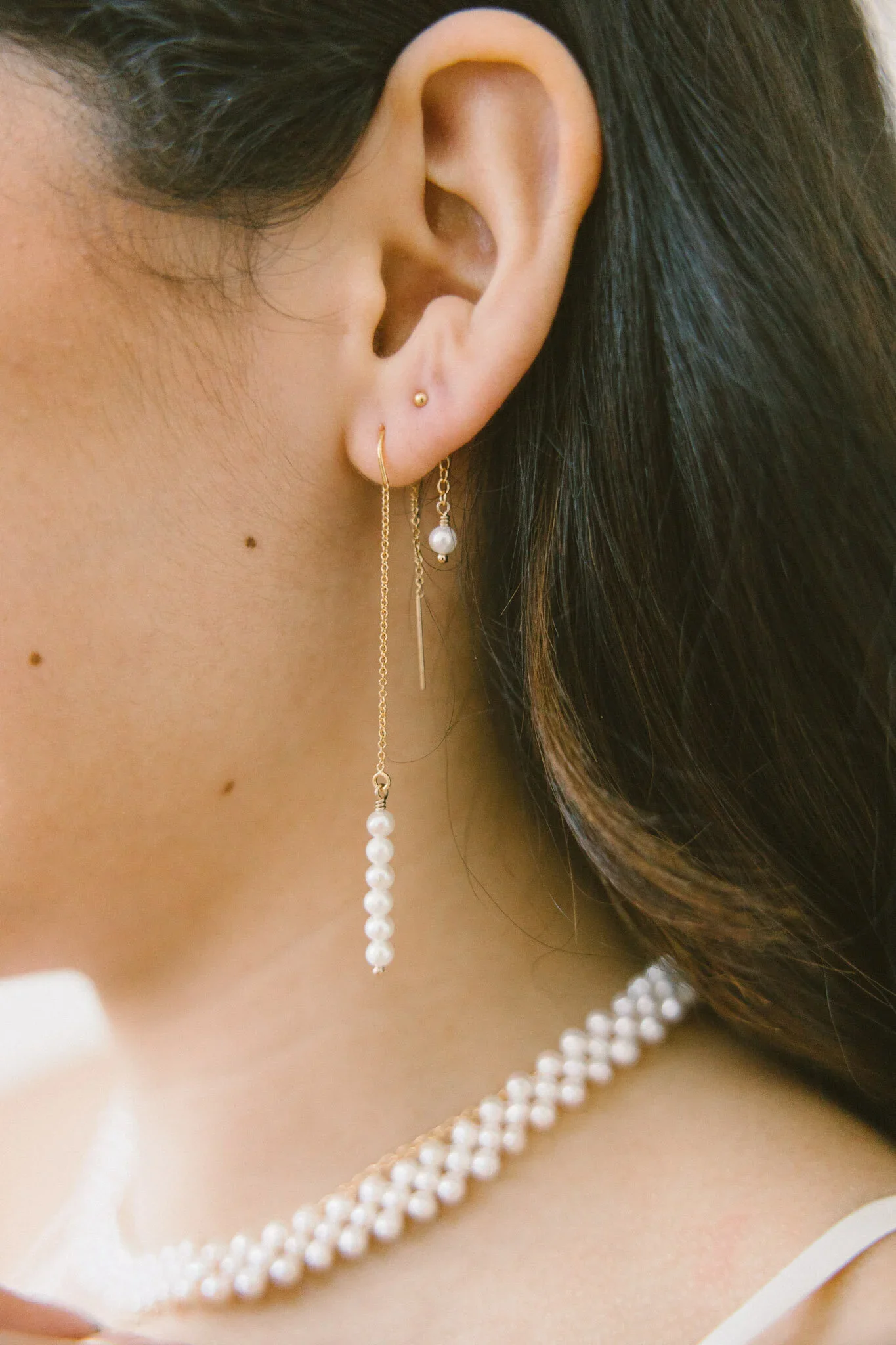 mix matched white and pink pearls dangling from a pair of our valentina hoops. pearls can be removed to transform your look.