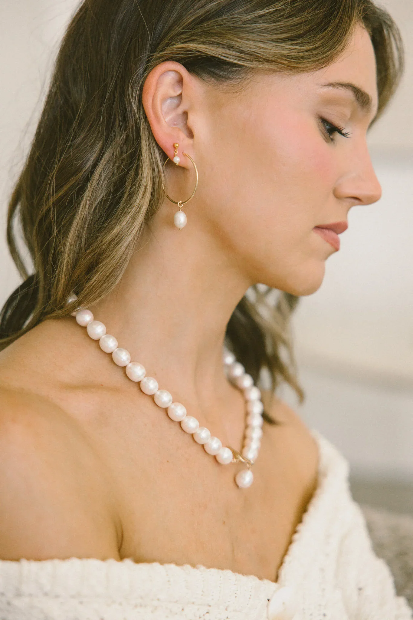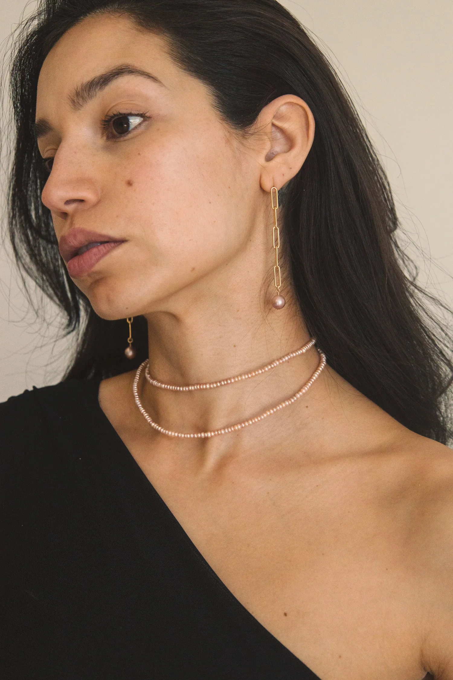 one small oval-shaped white freshwater pearl dangling from a dainty cable chain earring threader. sold as a pair