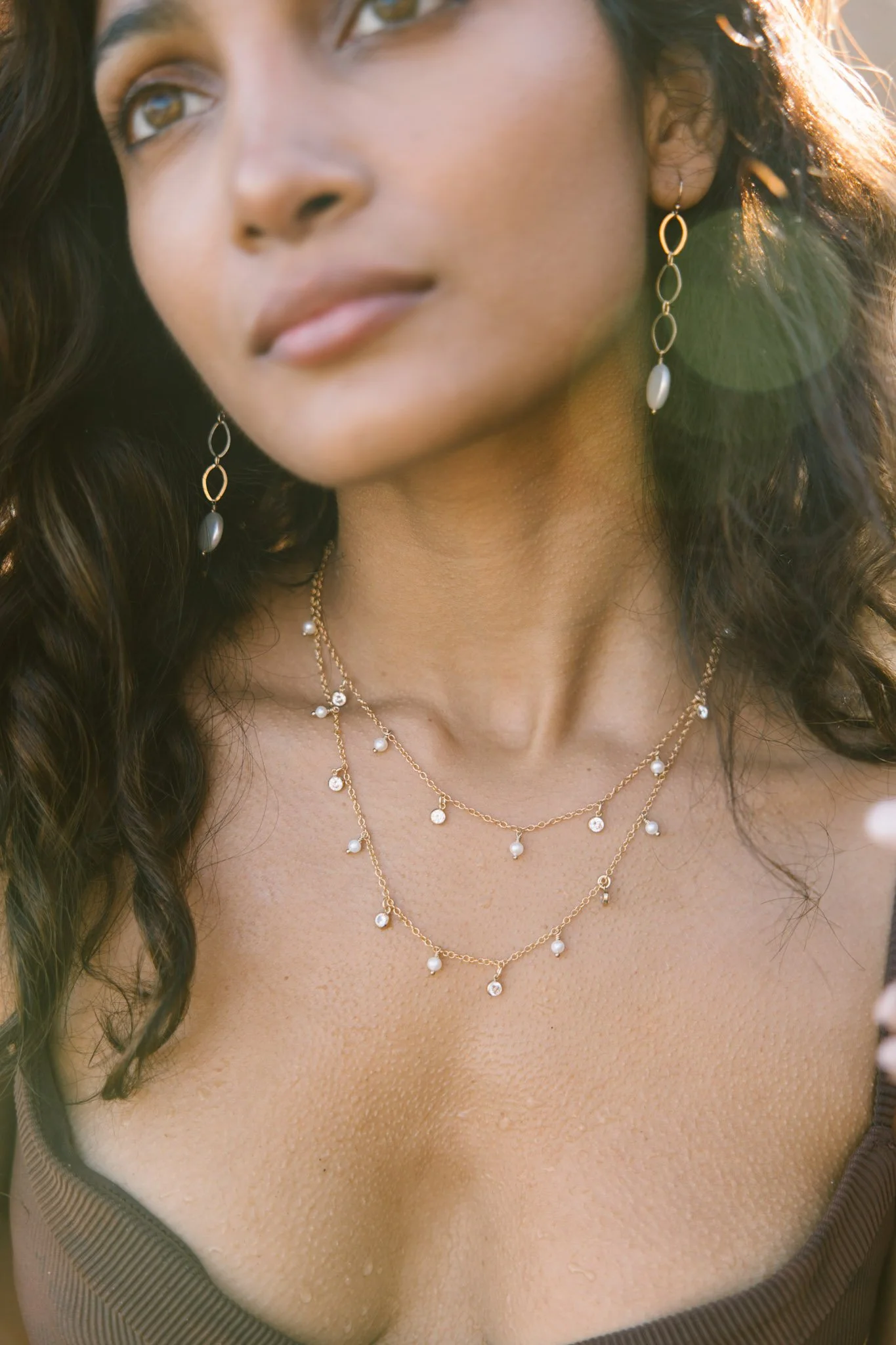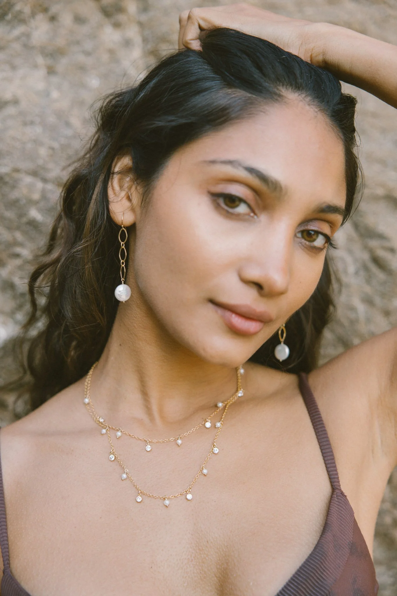 luscious irregular keishi pearls dangling from a pair of gold hoops with an extra pearl embellishment at the bottom