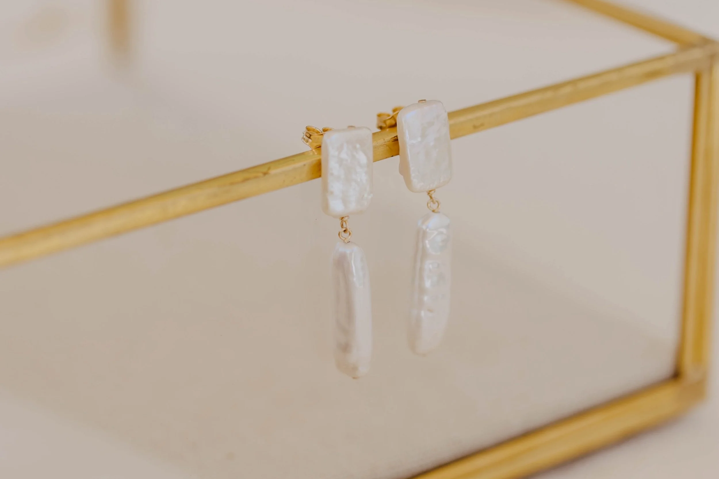 two biwa pearls dangling from a pair of rectangular-shaped natural freshwater pearl studs